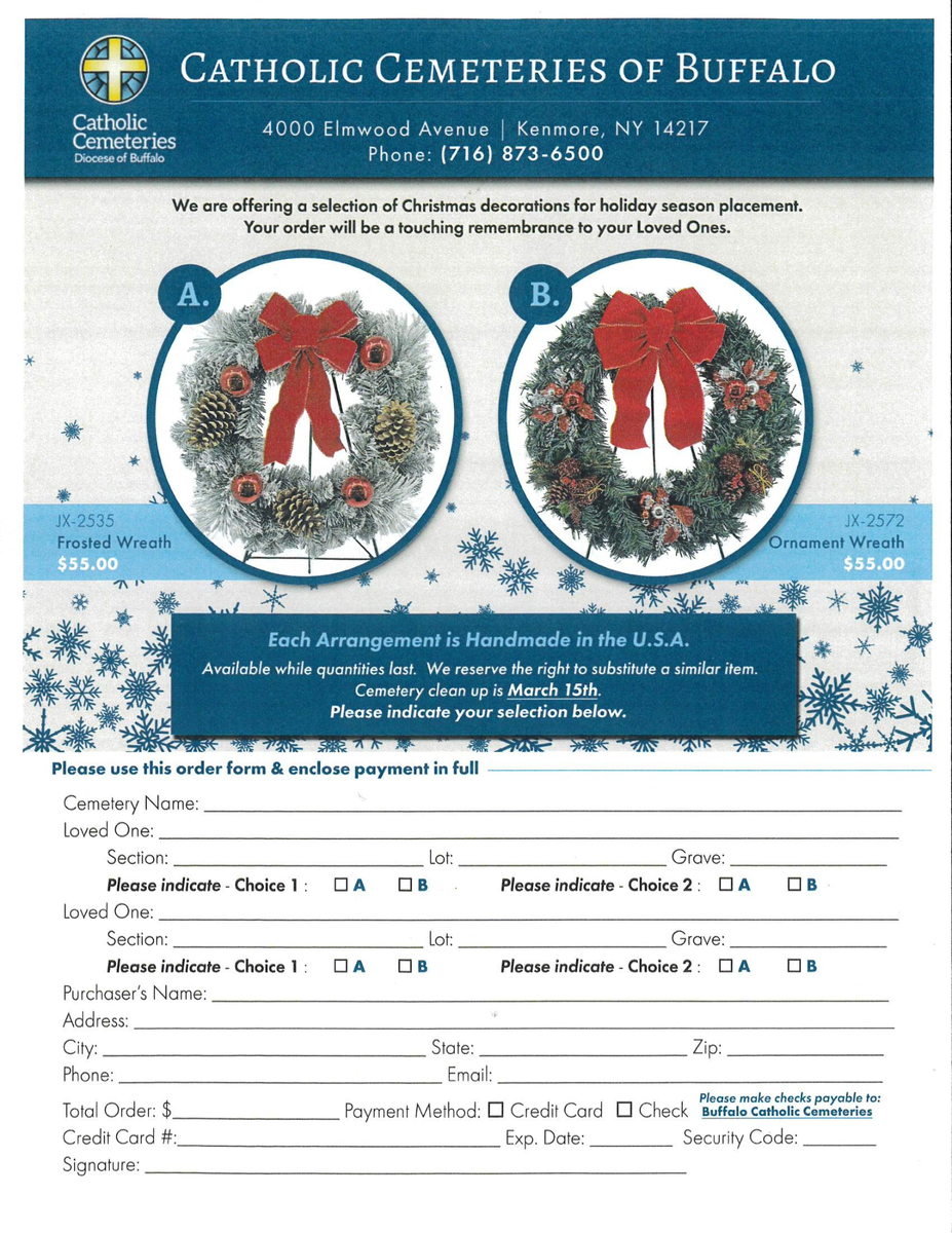 *Check out our Facebook page Buffalo Catholic Cemeteries for 2024 inventory and receive $10 off your wreath purchase while supplies last.*